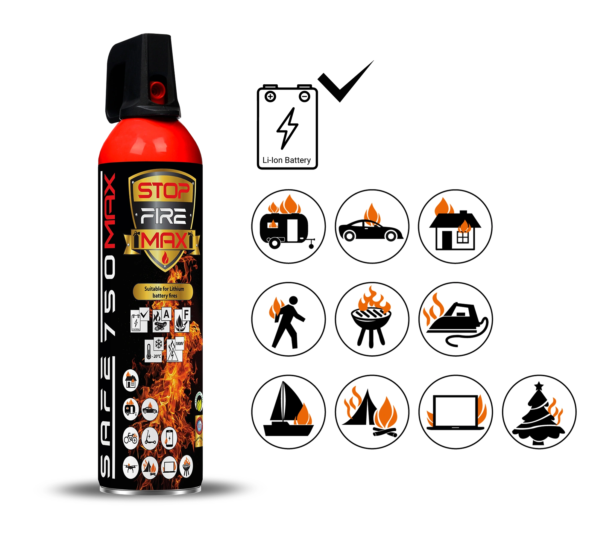 Hasivo SAFE 750 MAX je vyvíjeno a vyráběno v Evropské unii na základě platné licence výhradně pro značku SAFE. Díky vyššímu obsahu aktivních látek se tento sprej řadí mezi nejúčinnější a nejuniverzálnější hasicí prostředky na trhu s přidanou hodnotou aplikace i na začínající požáry lithiových baterií. Vyniká účinností při minimální spotřebě i unikátním složením, které překonává běžné standardy konvenčních hasicích sprejů dostupných na našem trhu.